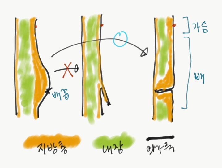 왼쪽 그림은 현재 상태. 음 크게 나쁘지는 않다. 하지만 예쁘지는 않아서 가운데처럼 (구멍 뚫어) 지방제거술을 하면 가운데 그림처럼 남는 가죽이 늘어질 테니, 2차 제거술이 필요하다. 가죽을 잘 당겨서 배꼽인 것처럼 위장해 줄 수는 있겠지만, 애써 노력한 내 살을 밖으로 빼내는 것은 일단 아깝고, 정의롭지도 못하다. 그래서..