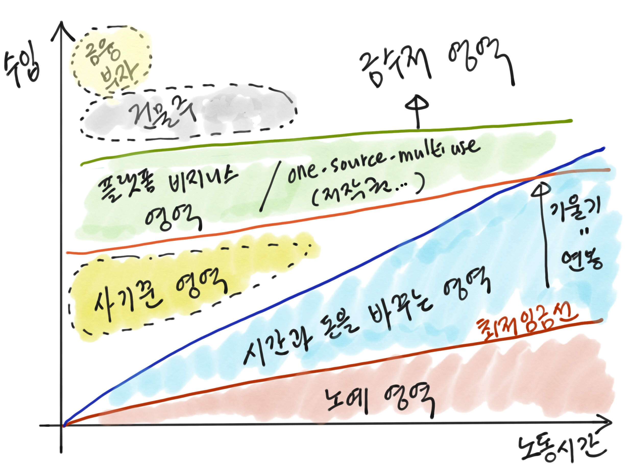 보통 돈을 번다는 것은 시간(에 따른 노동)을 돈을 바꾸는 것을 의미한다. 회사도 마찬가지이다. 누군가 더 열심히 일하거나, 더 많은 사람이 일할 때 거의 비례해서 매출이 올라간다면 모두 시간과 돈을 바꾸는 '불쌍한' 영역이다. 노동의 신성함과 상관없이. 당연히 개인이라면 최저 임금 이상을 받아야 하는 것처럼, 회사도 월급 줄 돈을 벌어야 "노예의 영역"에서 벗어난다. 우선 자기 사업이 그런가 보자.