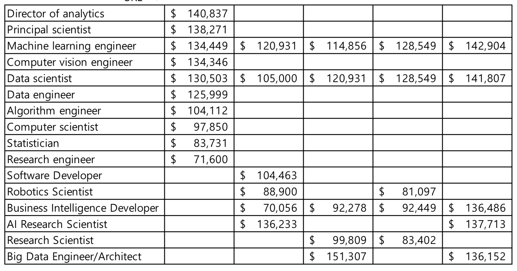 각 컬럼의 소스: 차레로 [1], [2], [3], [4], [5])이고, 모두 2018년 2월-9월 사이에 조사되었다. 비슷비슷한 이름들이 있다. 연봉은 대개 Glassdoor의 평균 값을 적은 것인데 약간의 편차가 있기는 하다. (실리콘밸리 기준으로 보면 좀 작아보인다. 미국 전체의 평균 값이라 그럴 수 있다고 퉁치자. 그래도 BI developer는 하나가 유독 크다.)