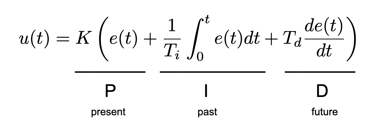 바뜨, 모든 PID 제어의 설명 맨 앞에 있는 다음 식의 어디서 본듯한 모양의 적분 기호와 미분을 암시하는 듯한 알파벳 d가 학생들로 하여금 PID 제어의 본질을 이해하는 걸 방해를 할 지도 모른다고 바로 느껴진다. (이 글을 읽고 계신 여러분들도 그러신가?)