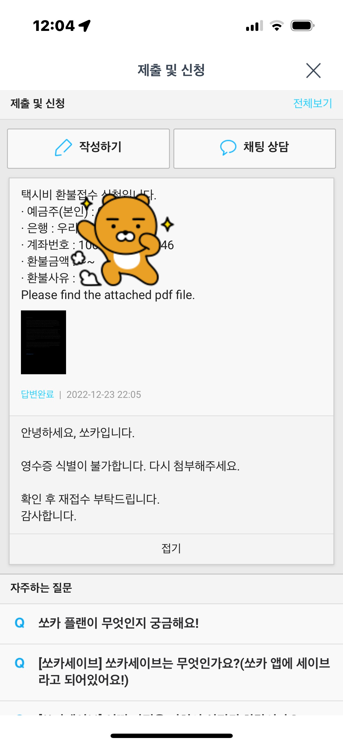 7. 소카의 환불 요청 UI 에는 영수증 사진 넣는 곳만 있어서.. 위 내용을 PDF로 첨부해 다음과 같이 신청을 했고 답이 왔음 (사진 아래쪽)