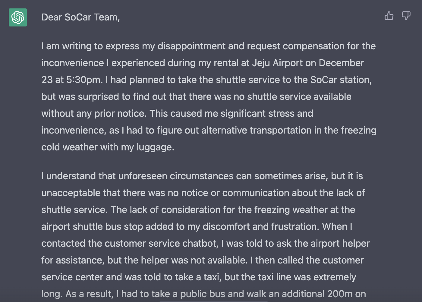 I am writing to express my disappointment and request compensation for the inconvenience I experienced during my rental at Jeju Airport on December 23 at 5:30pm. I had planned to take the shuttle service to the SoCar station, but was surprised to find out that there was no shuttle service available without any prior notice. This caused me significant stress and inconvenience, as I had to figure out alternative transportation in the freezing cold weather with my luggage.