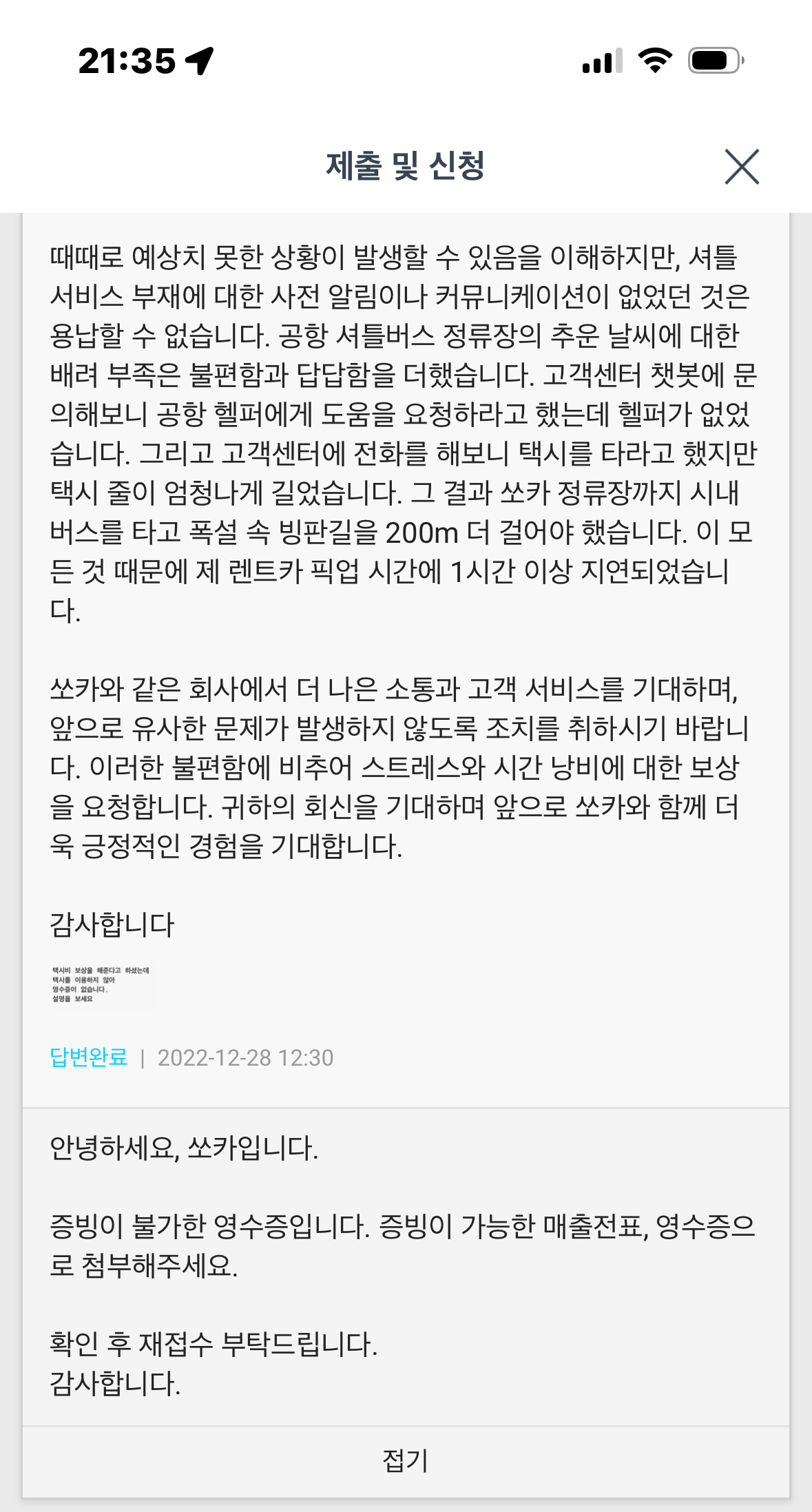 I understand that unforeseen circumstances can sometimes arise, but it is unacceptable that there was no notice or communication about the lack of shuttle service. The lack of consideration for the freezing weather at the airport shuttle bus stop added to my discomfort and frustration. When I contacted the customer service chatbot, I was told to ask the airport helper for assistance, but the helper was not available. I then called the customer service center and was told to take a taxi, but the taxi line was extremely long. As a result, I had to take a public bus and walk an additional 200m on an icy road in heavy snow to reach the SoCar station. All of this added up to a delay of over an hour in my rental car pick-up time.