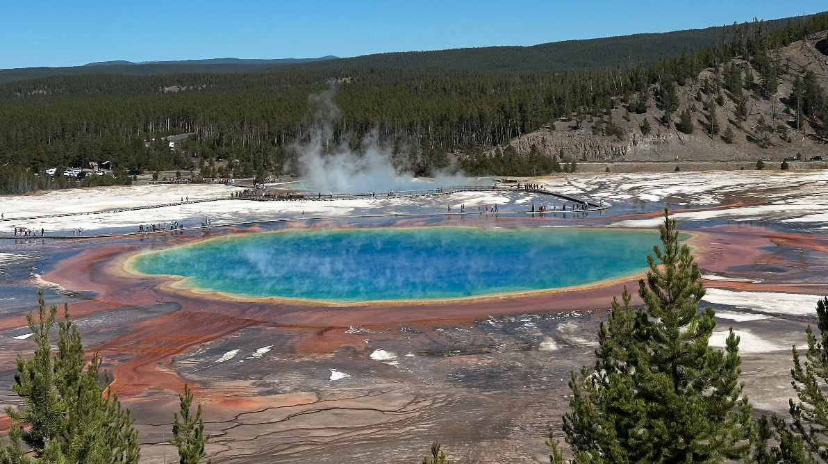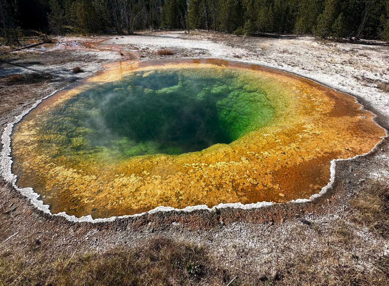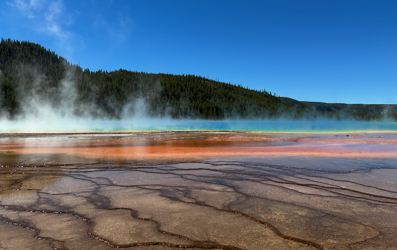 옐로우스톤 하면 생각나는, 또 늘 사진에 등장하는 또 다른 하나는 (유황과 박테리아가 열 일을 해서 만든) 심하게 예쁜 물 웅덩이(pool, spring)들이다. 일단 예쁘고 신기하다. 작은 거 부터 심하게 큰 거 까지... 그 주변도 예쁘다. 이게 사진도 예쁘지만 직접 보면 훨씬 더 예쁘다.