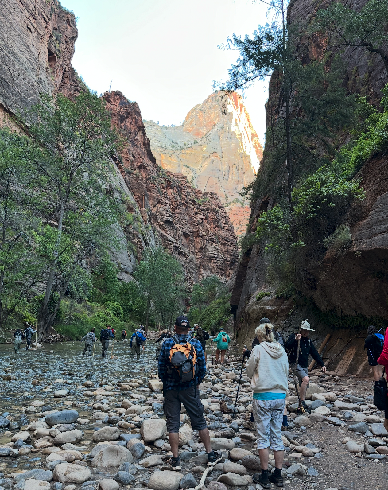 셔틀 버스를 타고 종점인 Temple of Sinawava까지 가서, Riverside Walk Trail을 따라 가벼운 트래킹을 했다. 그 Trail 끝에 The Narrows 라는 물길을 따라 tracking 하는 코스가 있는데, 깊은 곳은 가슴까지 물이 있단다. 그거 때문에 Zion Park에 오는 사람이 많다던데, 물로 차고 약간의 장비도 필요하다. 다들 비슷한 복장과 장비를 한 걸로 보아 아래쪽 (Springdale) 어딘가에 임대해주는 곳이 있는 것 같다. Narrows를 우리는 패스했다.