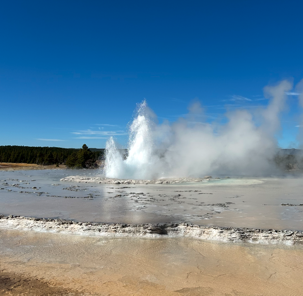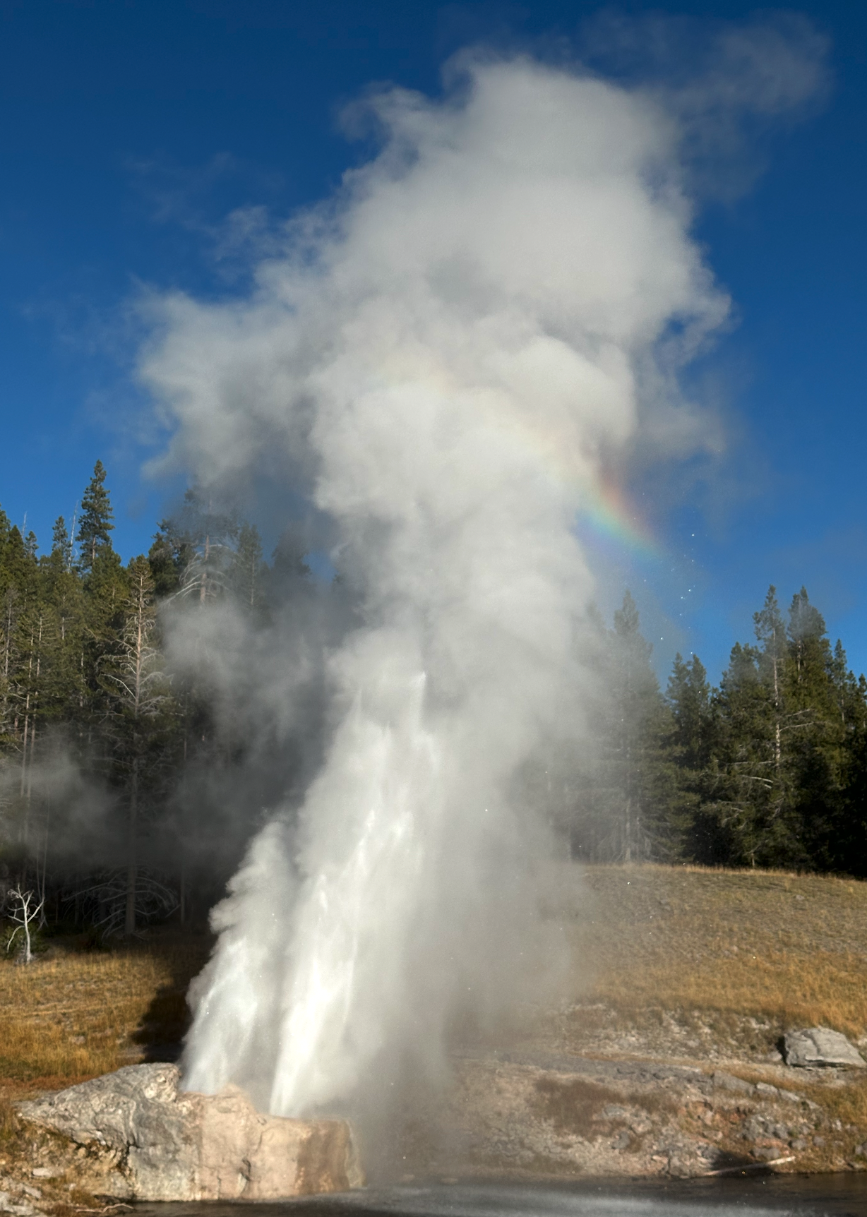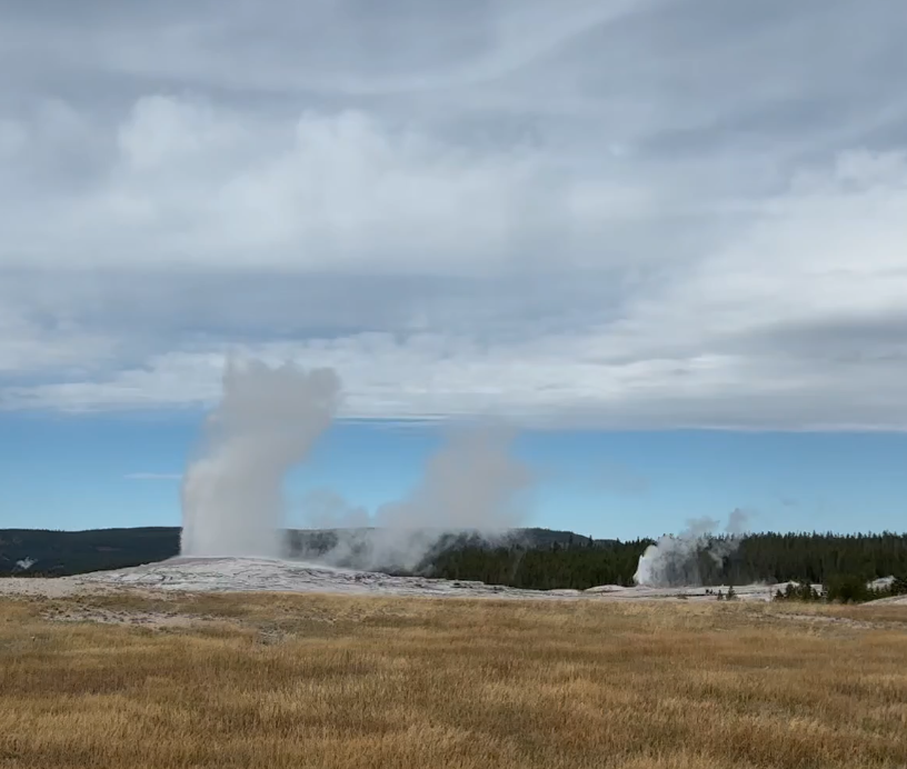 엘로우스톤하면 제일 먼저 떠오른 것이 간헐천(Geyser)이다. 우선 지가 알아서 물 (수증기, 이산화탄소, ..)를 뿜는다. 조금씩 계속 나오는 것도 있고, 많이 분출하는 것들이 오차가 적당히 큰 주기로 간헐적으로 뿜는다. 예정 시간을 오차와 함께 GeyserTimes 등의 앱에서 확인할 수 있다. 거의 비슷하다. 오차범위가 +/- 한시간 인것도 있다. 사진에서 많이 볼 수 있는 Oldfailful 빌리지의 큰 간헐천은 비교적 자주 뿜고 오차도 예정시간 +/- 10분 정도여서 밥먹다가고 보고, 지나가다가도 보고, 밤에도 볼 수 있다. 사람들이 많이 보이면 조금 있다 뿜는다. 오차가 30분 정도만 되도 '딱 그시간'에 가서 한시간을 기다려야 할 수도 있기 때문에 약간의 여유와 이동 전략이 필요하다고 볼 수 있다.