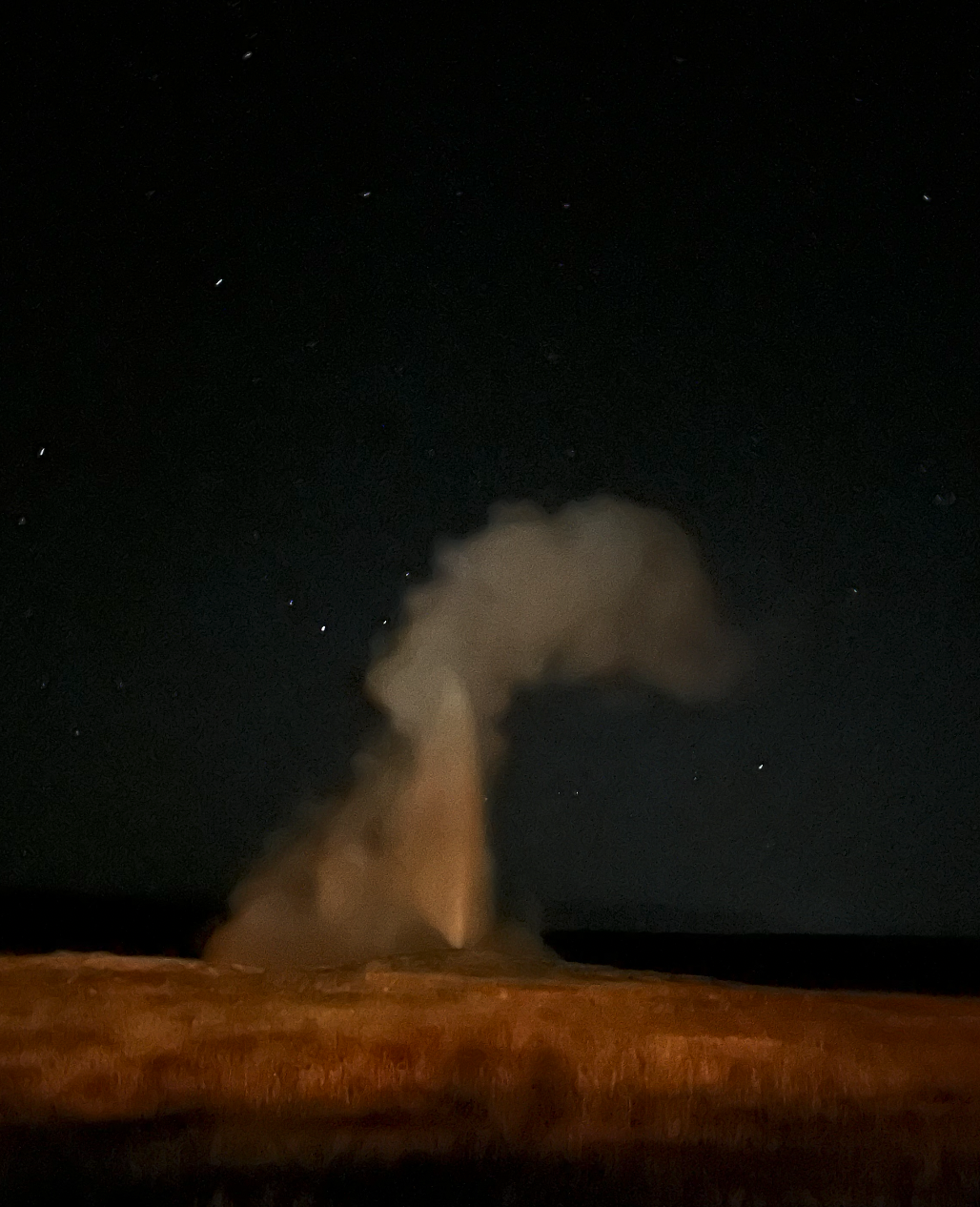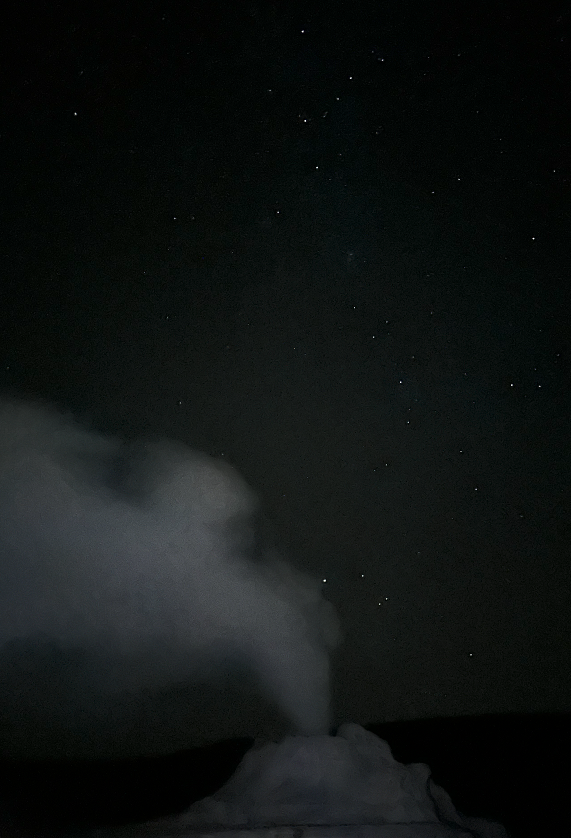 늘 한적한 곳에 가면 하늘의 별을 많이 볼 수 있어서 좋다. 별과 함께 간헐천을 보는 건 정말 대박이다. 밤에 춥기 때문에 옷을 단단히 입고 가야 한다. (밤도 밤이지만, 엘로우스톤이 해발고도 2400미터 정도 된다). 우리가 Oldfaithful에 갔던 날, 바이슨 먹고 있는데, 식당 직원이 그날 밤에 오로라가 보일 예정이라고 알려줬다. 그렇지 않아도 밤에 별을 볼 생각이었는데.. 하여간 Oldfailful에서 잔 두 밤 모두 야심한 밤에 겨울옷 껴입고, 와인 한 병, 맥주, 과자들고 나가서 별도 보고, 간헐천 터지는 거 가다렸다가도 보고 너무 좋았다. 그런데 우리 밖에 없었다. Oldfaithful 간헐천은 village 바로 앞이라 조명이 좀 있었는데도 별이 잘 보인다. 사진 아래 Castle Geyser는 숙소에서 좀 거리가 있었는데, 가로등 따위는 전혀 없어서 휴대폰 라이트에 의존해서 갔다. 한시간 이상 기다렸는데 야크 소리도 나고, 늑대 울음 소리도 나고..