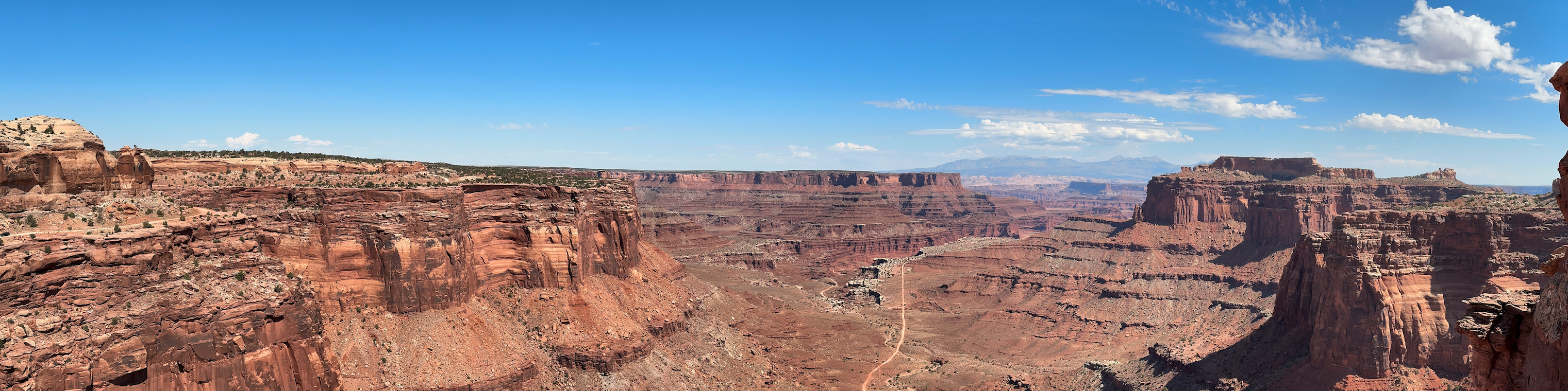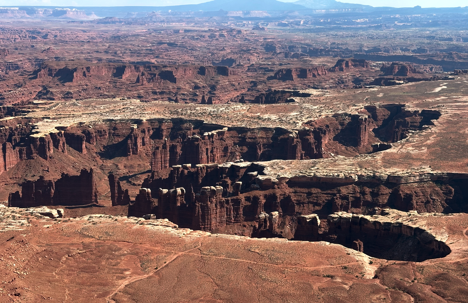 Canyon Lands 자체는 큰 협곡이라 사진에 잘 안 담긴다. 완전 멋진데, 완전 땡볓이다. 대략 밥먹을 곳도 마땅치 않다. 먹거리를 준비하는 것이 좋다. 차로 길 따라 가면서 각 포인트에 내려서 구경하면 된다. 일부 포인트는 꽤 걷기도 한다. 협곡 아래는 허가를 받은 차만 내려갈 수 있는데, 퇴적암의 최상단이 하얀색이러서 그런지 white rim trail 이라고 한다. 예전에 우라늄 광산 때문에 만들 길로 100마일 정도래나 어쨌데나다. 그걸 작정하고 온 사람들도 꽤 있는 듯 하다.