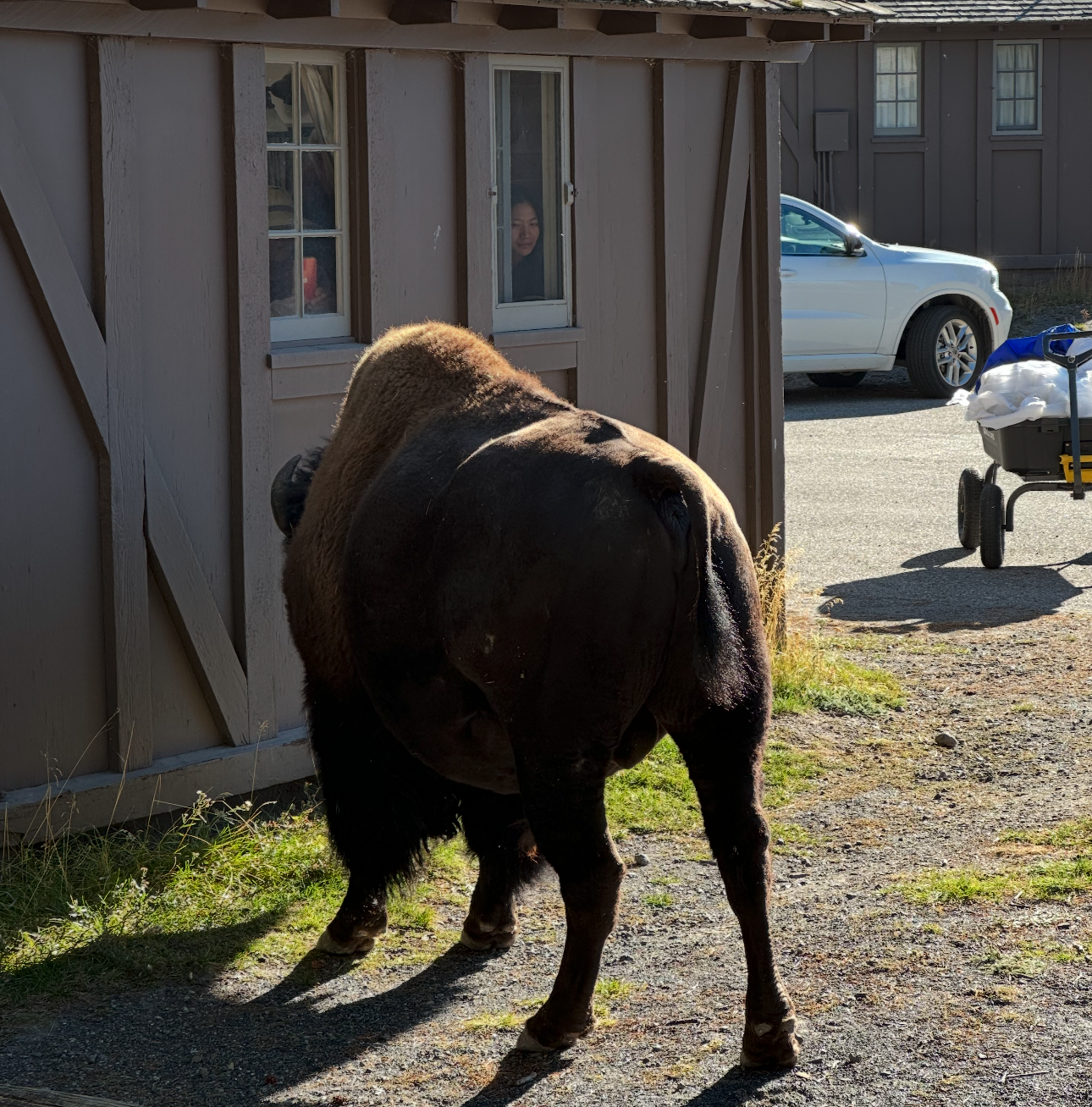 처음 공원에 들어갈 때 바이슨 한 마리가 길가에 있어 한참 봤는데 나중에 보니 바이슨은 엘로우스톤에서 그리 귀한 야생 동물은 아니었다. 강가의 초원 지역으로 가면 떼거리로 풀을 뜯어 먹고 있고, 사람이 많은 Oldfaithfull 지역 근처 풀밭에도 한두마리씩 보이고, 가끔은 이것들이 길을 건너기 위해 차를 막기도 한다. 옐로우스톤 둘째날 Oldfaithful의 식당에서 저녁으로 바이슨 갈비를 먹을 수 있을 정도 었으므로 전혀 보호종이 아닌 것이 분명하다.