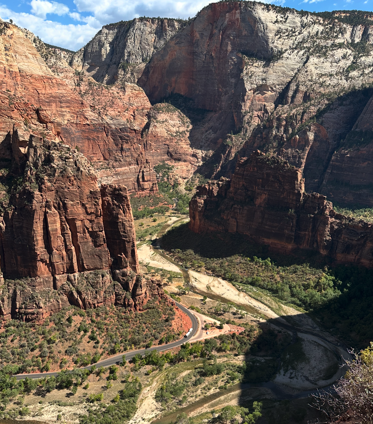 Zion National Park은 큰 바위 동산이다. 이게 말로 잘 설명이 안된다. 그 중 하나인 Angel's Landing은 tracking은 아니고 약간의 등산 모드인 곳이다. 앞의 Riverside walk은 그래도 숲길 비슷한데, Angel's Landing 가는 길은 땡 볓에 바위산을 돌아돌아 겁나게 올라가야 한다. (민간인은 왕복 4시간 코스, 사실 좀 선선한 아침에 이걸 했어야 하는데 Angel's Landing 마지막 부분은 예약제로 운영되는 ticket이 필요하다. ticket은 선착순이 아니고 추첨제이다. 예약을 12시 꺼 밖에 못해서리 완전 땡볓 시간. 나중에 꼭대기 표검사 한다고 표시된 곳에 가보니 표가 있어야 한다는 표식만 있고 실제 검사를 하지는 않았다. 길이 없는 바위를 한 명씩 줄 잡고 올라가야 해서 그냥 인원 관리 차원에서 예약을 받는 거였다는...)