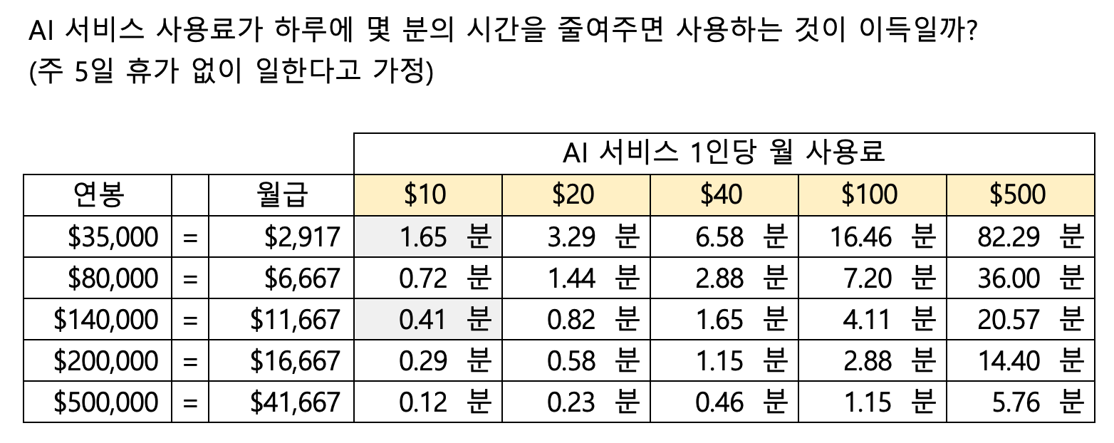 AI 서비스를 사용해서 (개발자 포함) 근로자가 하루에 몇 분의 시간을 절약하면, 본전일까? 를 계산한 표다.