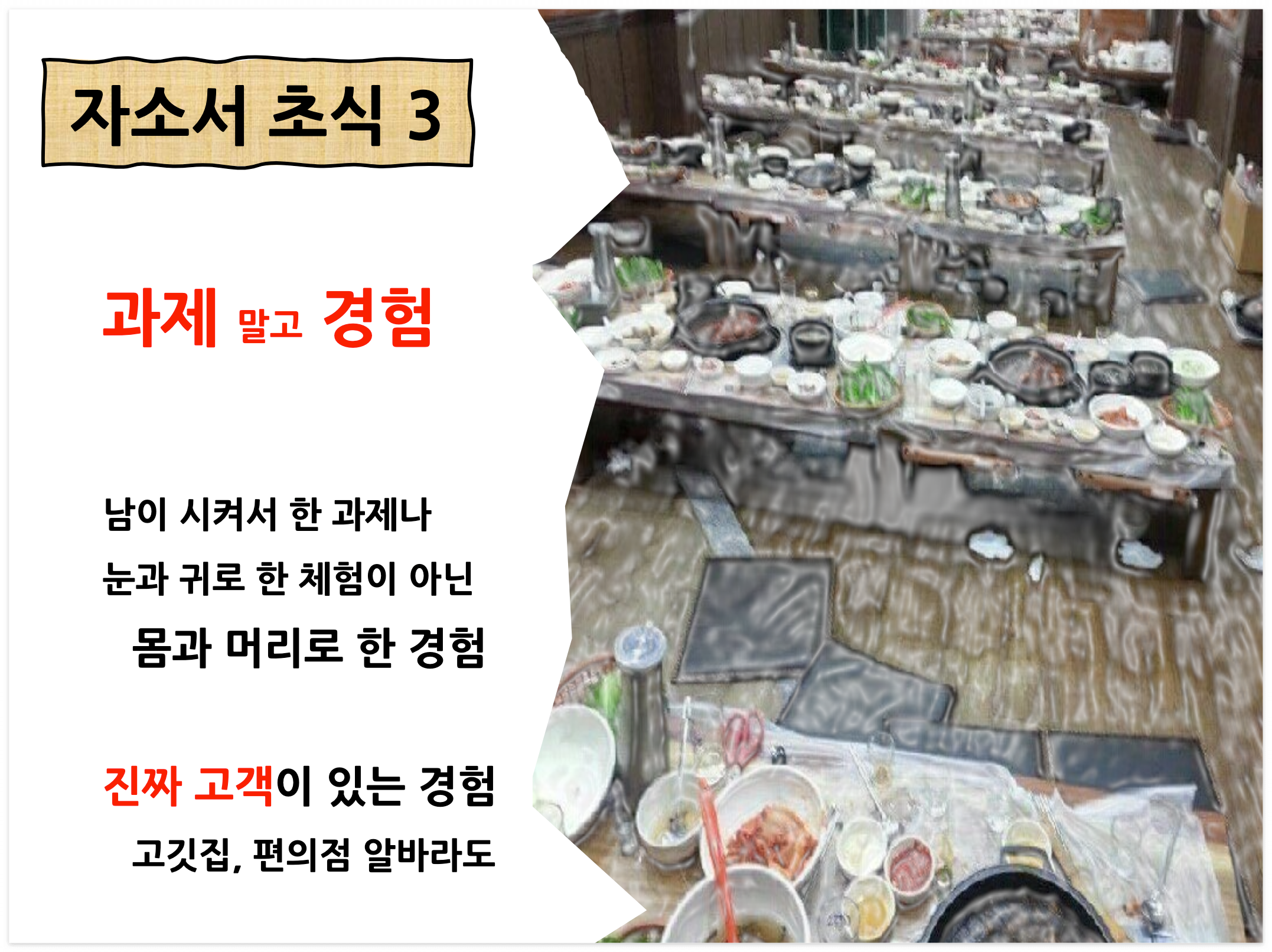예를 들면, 고깃집 알바 경험 좋습니다. 일머리가 느는 좋은 경험이죠.