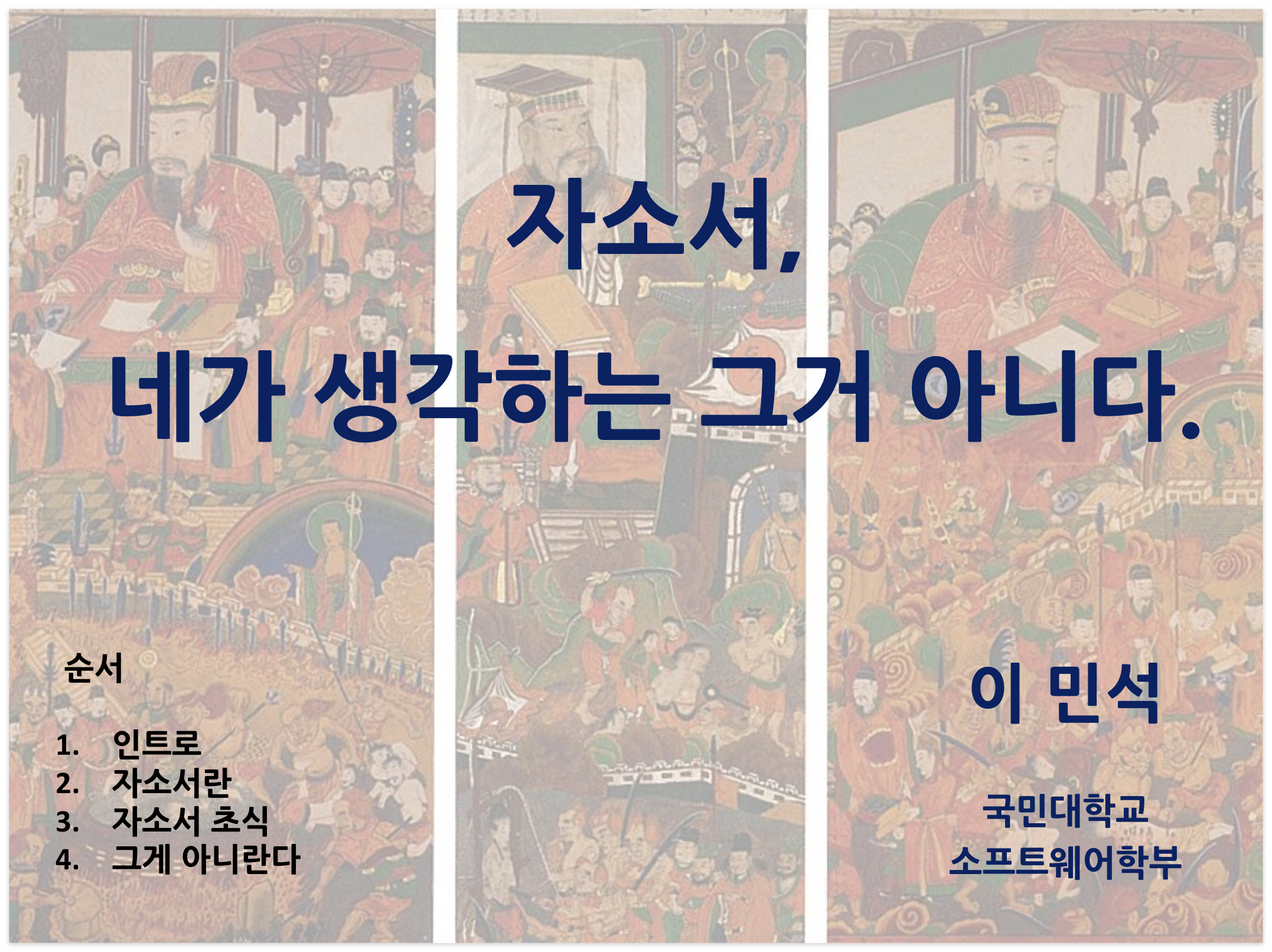 자소서, 네가 생각하는 그거 아니다. 이 민석 국민대학교 소프트웨어학부 순서 인트로 자소서란 자소서 초식 그게 아니란다